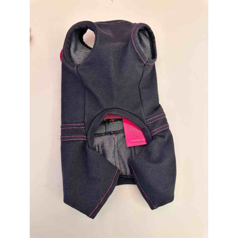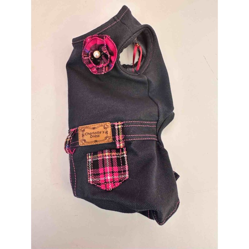 Tutina 4 zampe in morbido jeans elasticizzato Special Boutique con coccarda spilla e dettagli scozzese ciclamino/ fuxia, piccola perla per un tocco chic.