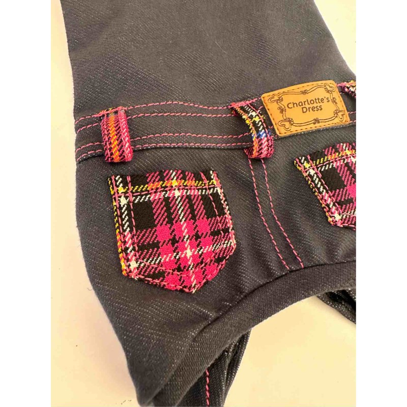 Tutina 4 zampe in morbido jeans elasticizzato con coccarda spilla e dettagli scozzese ciclamino/ fuxia